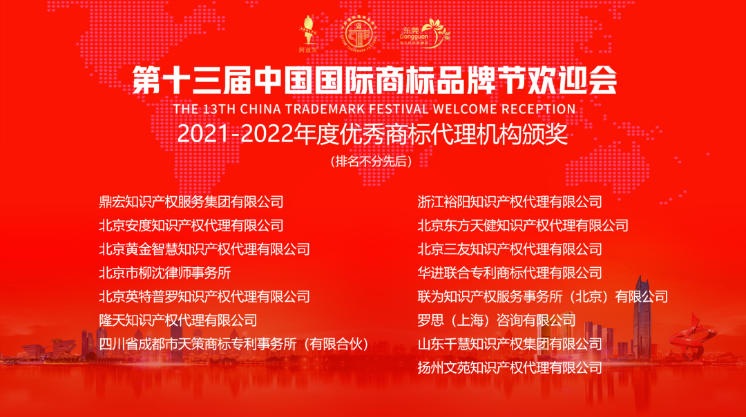 在6月16日舉辦的第十三屆中國(guó)國(guó)際商標(biāo)品牌節(jié)歡迎會(huì)頒獎(jiǎng)活動(dòng)中,華進(jìn)憑借規(guī)范的團(tuán)隊(duì)管理、高質(zhì)量的專(zhuān)業(yè)服務(wù)和良好的業(yè)界聲譽(yù)榮獲“2023年度品牌商標(biāo)建設(shè)卓越貢獻(xiàn)獎(jiǎng)”,并被評(píng)為“2021-2022年度優(yōu)秀商標(biāo)代理機(jī)構(gòu)”。