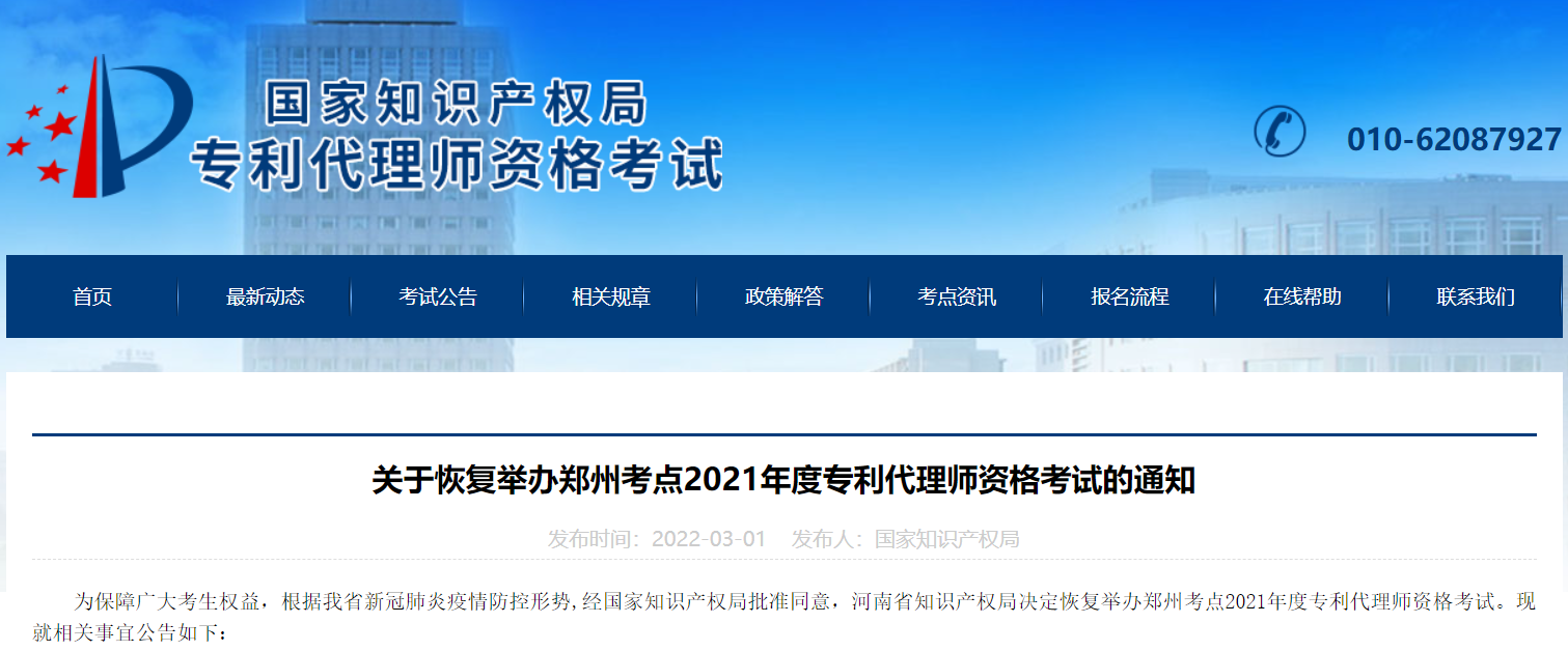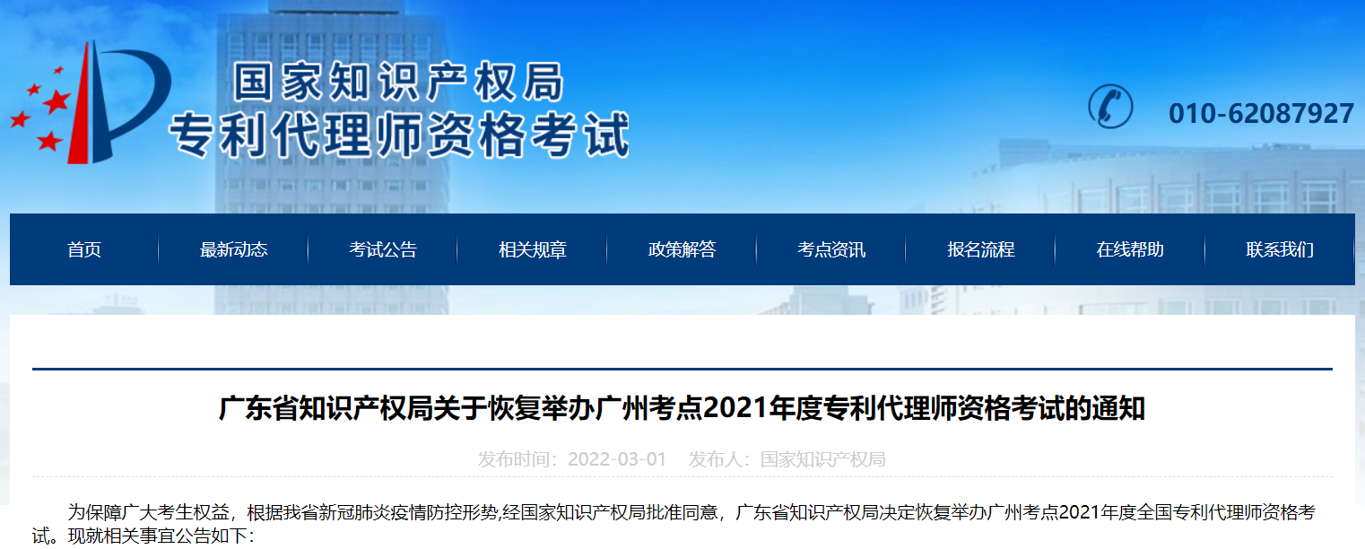 近期,多地發(fā)布關(guān)于恢復(fù)舉辦2021年度全國專利代理師資格考試的通知。廣州、鄭州、杭州、重慶、西安考點(diǎn)將于2022年3月26日至27日恢復(fù)舉辦2021年度全國專利代理師資格考試。