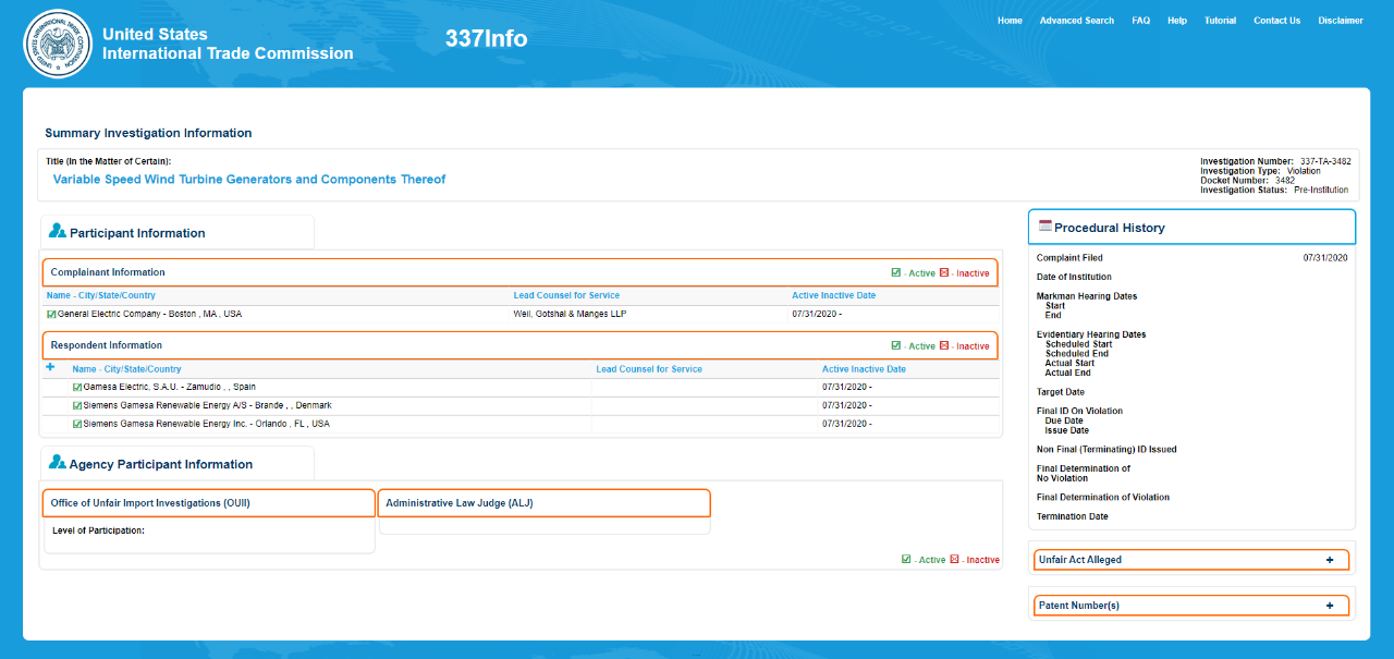 根據(jù)美國國際貿(mào)易委員會(huì)(ITC)官網(wǎng)發(fā)布的消息(337-TA-3482),通用電氣公司(GE)于2020年7月31日在ITC發(fā)起337條款訴訟,狀告西門子歌美颯(Siemens Gamesa)的“變速風(fēng)力發(fā)電機(jī)及其部件”侵權(quán)GE的兩件美國發(fā)明專利(US 7629705, US 6921985)。這是GE在風(fēng)電領(lǐng)域發(fā)起的又一波重大專利訴訟!