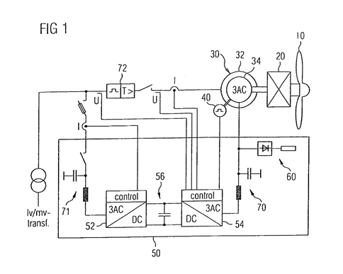 221專利于2008年1月22日獲得授權(quán),名稱為:“風(fēng)力發(fā)電設(shè)備及其操作方法(Method for Operating a Wind Power Plant and Method forOperating it)”。該專利技術(shù)旨在克服陣風(fēng)導(dǎo)致的能源波動(dòng)對(duì)風(fēng)力發(fā)電設(shè)備的影響,使得在電壓下降之后穩(wěn)定電源電壓而不會(huì)危害到風(fēng)力發(fā)電設(shè)備中的電氣元件……