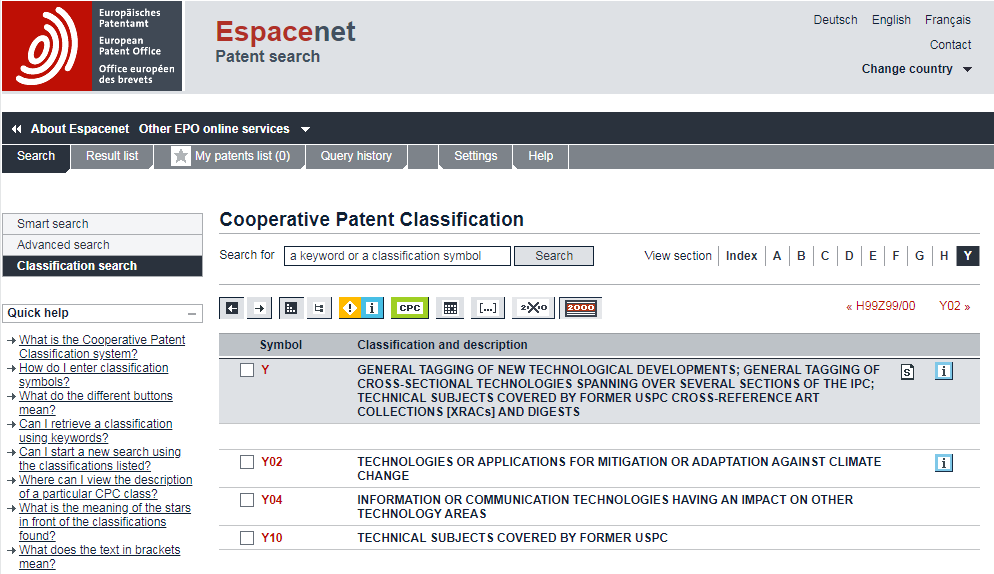 進(jìn)入EPO的專利數(shù)據(jù)庫Espacenet使用分類號檢索,點(diǎn)擊“Y”部就可找到“Y02”、“Y04S”。