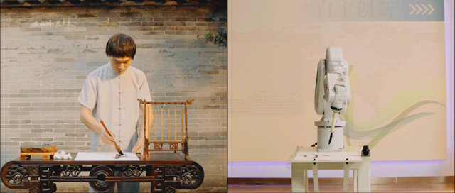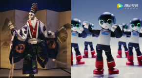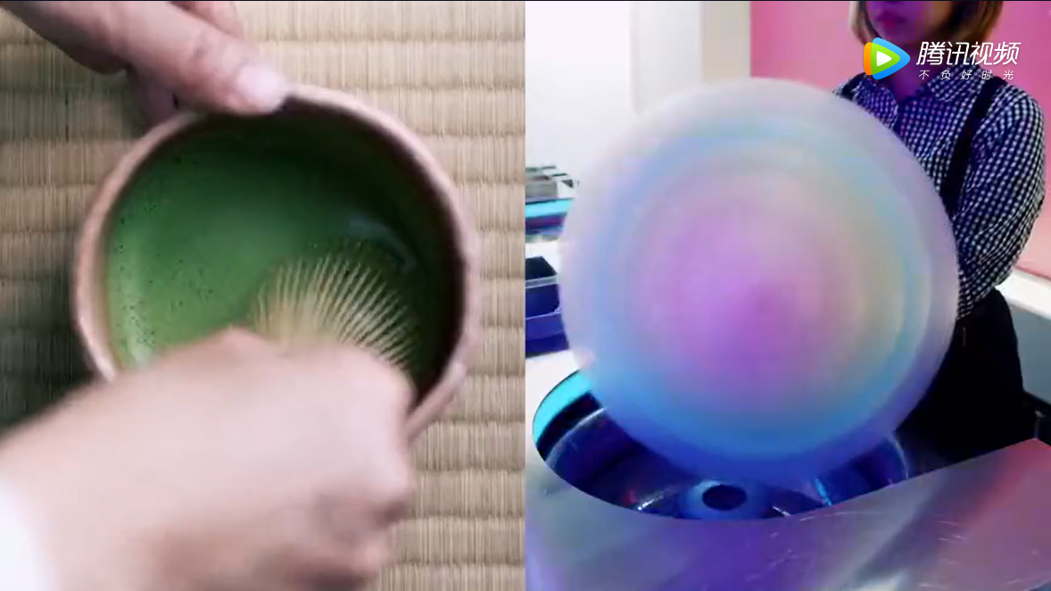 如:在杭州視頻中的中國傳統(tǒng)戲曲與智能機器人共舞,而在東京視頻中則存在木偶戲與智能機器人共舞的橋段;杭州視頻中的綠茶和咖啡的對比,而在東京視頻中則存在抹茶和棉花糖的對比;杭州視頻中的傳統(tǒng)書法與通過智能機器人書寫書法,在東京視頻中同樣有這一表達。