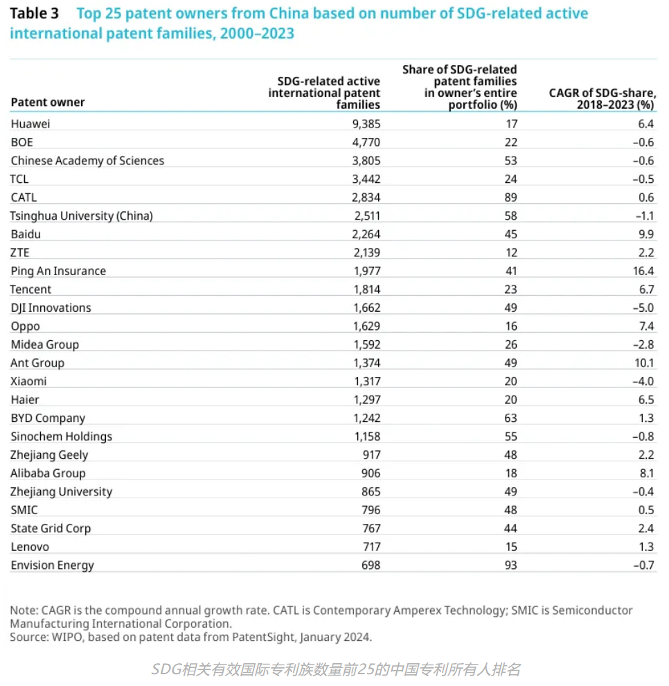 SDG相關(guān)專利申請(qǐng)活動(dòng)在世界各地均有增加,不過中國近年來的專利申請(qǐng)量呈指數(shù)級(jí)增長。在中國申請(qǐng)人排名中,以華為為首,其次是BOE、中國科學(xué)院和TCL。